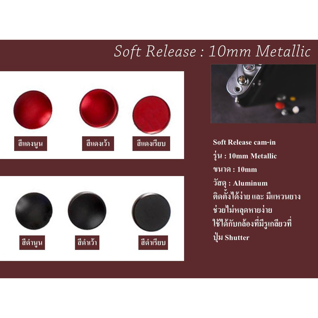 Soft Release 10mm Metallic by JRR ซึ่งเป็นสินค้าในหมวดหมู่ กล้อง> อุปกรณ์เสริมกล้อง> ค่าเริ่มต้น ที่มีคุณสมบัติ คือ **PROMOTION ส่วนลด** สมาชิกใหม่ใช้โค๊ด NEWKASS ได้รับส่วนลด 100 บาท เมื่อซื้อสินค้าตั้งแต่ 200 บาทขึ้นไป *สำหรับการซื้อทาง Application เท่านั้นซื้อสินค้าตั้งแต่ 250 บาทขึ้นไป มีส่วนลดค่าส่งสินค้า** ทางไปรษณีย์ 30 บาท / KERRY 65 บาท **KERRY รับส่งสินค้าที่สาขา คือ ผู้ขายนำพัสดุไปส่งที่ศูนย์บริการ KERRY ด้วยตนเอง และทาง KERRY จะนำส่งสินค้าไปให้ถึงตามที่อยู่ของลูกค้า ภายใน 1-3 วันทำการครับ** -------------------------------------------------- Soft Release 10mm Metallic ขนาด : 10mm วัสดุ : Aluminum ติดตั้งได้ง่าย และ มีแหวนยางช่วยไม่หลุดหายง่าย ใช้ได้กับกล้องที่มีรูเกลียวที่ปุ่ม Shutter #JRR #fuji #fuji #fujifilm #soft #release #shutter #leica #ปุ่ม #ชัตเตอร์ #ปุ่มชัตเตอร์